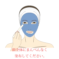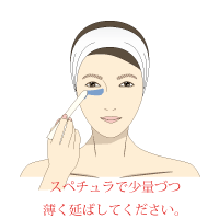 パッククリームをスパチュラでとり、強くこすらないように均一に塗ります。(お肌全体・一回につき1袋10gが目安。その他、部分使用には適量を塗ります。)そのまま2~5分待ちます。(注)目や口の周り、傷やはれもの、湿疹などの異常がある部位にはご使用にならないでください。