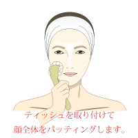 クリーナーのヘッドにティッシュペーパーを巻きます。しっかり手に持ち、お肌をパッティングします。楽花の化粧水とジェルの成分がイオン化現象をおこし肌細胞に活力を与え保湿力・免疫力・治癒能力を向上させ肌細胞のキメが揃うことが実感できると思います。使用後のティッシュは処分してください。