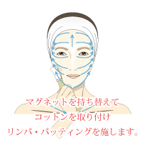 クリーナーの小さいマグネット部分にコットンを付け、楽花の化粧水を染みこませ、お肌全体をリンパ・パッティングします。顔にあるリンパが磁力に反応し血液の流れを良くし、リンパに溜まっている疲れを分解していくことによってリフトアップ効果も期待できます。くすみやこじわなどの原因になっている肌細胞の疲れ・老化・ストレスなどにも刺激を与え本来、肌細胞が持っている治癒能力を発揮します。